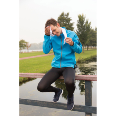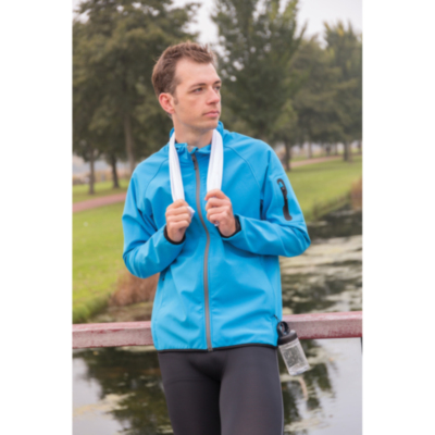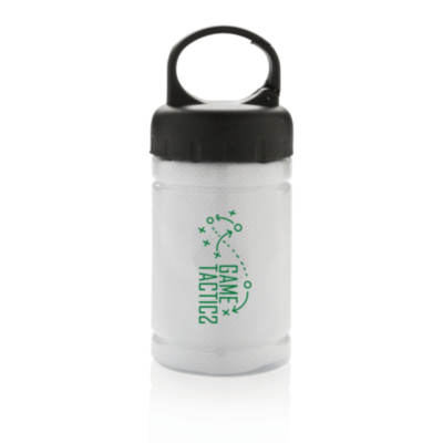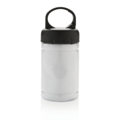 Toalla enfriadora de microfibra 100% libre de productos químicos. Bloquea el sol un 98% hasta protección solar UV 50+. La toalla se puede usar fácilmente añadiendo agua fría a la botella para que refresque rápidamente. La botella es de PP y parte superior de ABS. Incorpora mosquetón para que la puedas colgar en tus actividades al aire libre. 77 x 30cm.