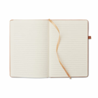 Libreta A5 con tapa rígida de PU reciclado de tacto suave. 80 hojas rayadas. Banda elástica y marca páginas.