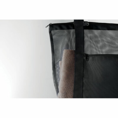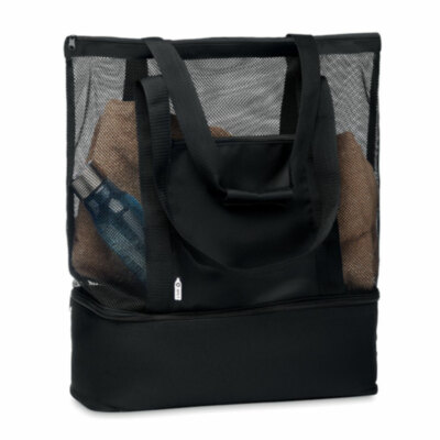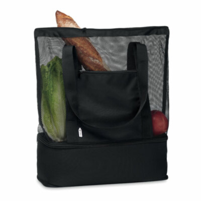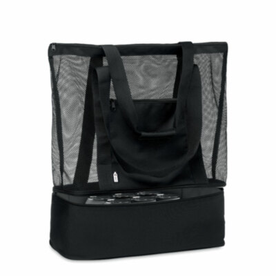 Bolsa de compra o para la playa de 600D RPET con asas largas. Bolsillo lateral de red RPET y compartimento frontal con cremallera. Compartimento inferior nevera.