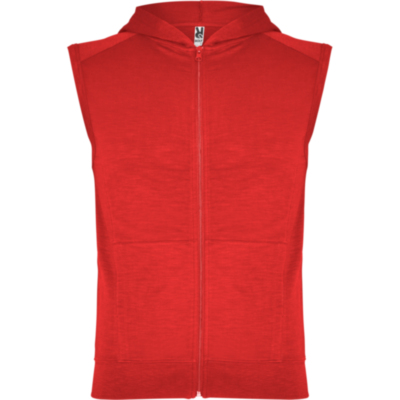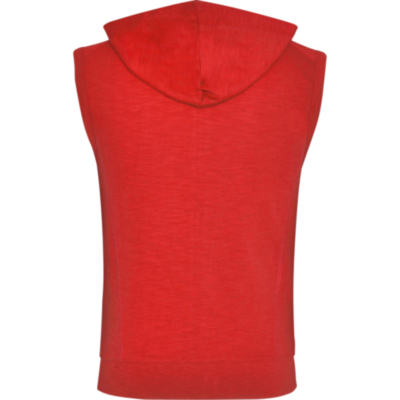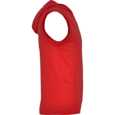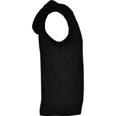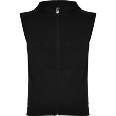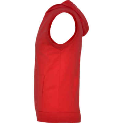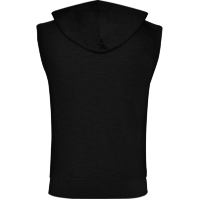 Chaleco con capucha, sisas con ribete ancho en el mismo tejido. Costura en hombro como detalle, creando canesú en la parte superior delantera. Bajo ancho en punto canalé. Cremallera central delantera y bolsillos laterales estilo canguro. Pinzas de entalle laterales.