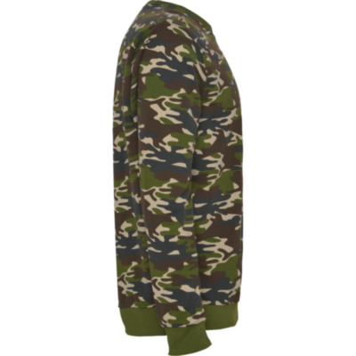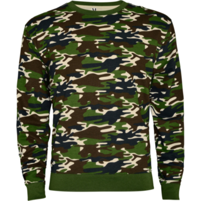 Sudadera estampado camuflaje, cuello a caja con forma redondeada y ribete de canalé. Punto de canalé 1x1 con elastano, en cintura y puños.