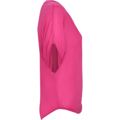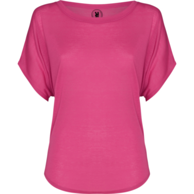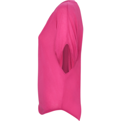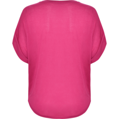 Camiseta oversize con cuello abierto, manga corta estilo murciélago y bajo redondeado.
