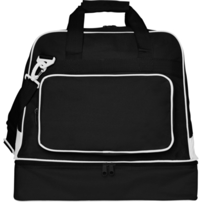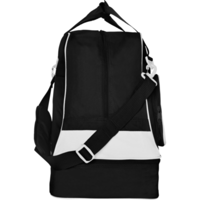 Bolsa deportiva doble asa para colgar y bolsillo frontal con cremallera. Doble fondo reforzado y cremallera para zapatillero. Anti-humedad. Base con tacos. Fácil limpieza.