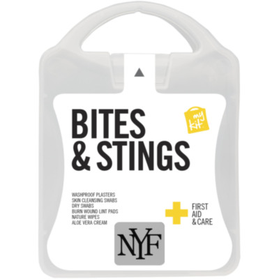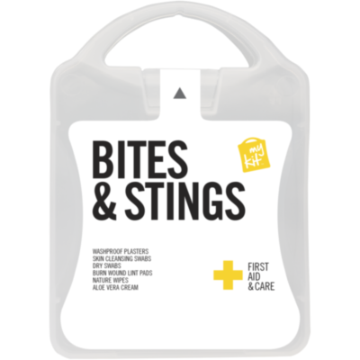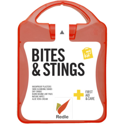 Kit ideal para prevenir las picaduras y mordeduras de insectos. Contenido: 12 apósitos adhesivos resistentes al agua, 4 toallitas limpiadoras, 2 toallitas secas, 2 gasas para quemaduras, 2 toallitas repelentes de insectos, 1 crema aloe vera. Todos los complementos de primeros auxilios cumplen todas las normativas de la UE. El precio incluye impresión a todo color en la etiqueta.