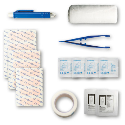 Kit ideal para cualquier amante de las mascotas. Con este kit estarás preparado para pequeñas heridas o picaduras que pueda sufrir mascota. Contenido: 12 apósitos adhesivos resistentes al agua, 4 toallitas limpiadoras, 2 toallitas secas, 1 quita garrapatas, 1 venda elástica, 1 pinza, 1 rollo de cinta adheisva. Todos los complementos de primeros auxilios cumplen todas las normativas de la UE. El precio incluye impresión a todo color en la etiqueta.