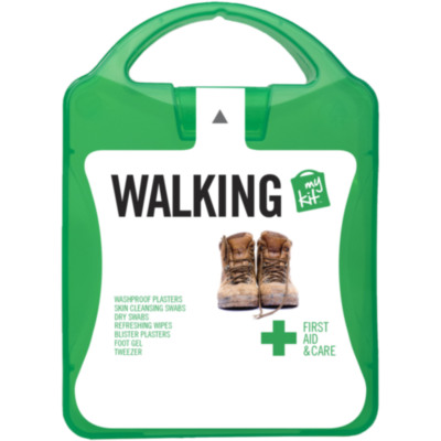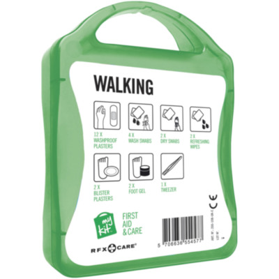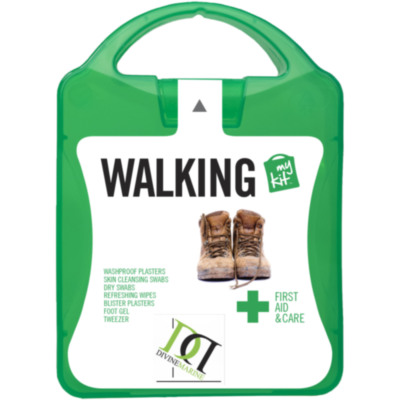 Kit ideal para caminatas. Con este kit estarás preparado para pequeños accidentes o ampollas y te mantendrás fresco durante tu caminata. Contenido: 12 apósitos adhesivos resistentes al agua, 4 toallitas limpiadoras, 2 toallitas secas, 2 toallitas refrescantes, 2 adhesivos para ampollas, 2 gel para pies, 1 pinza. Todos los complementos de primeros auxilios cumplen todas las normativas de la UE. El precio incluye impresión a todo color en la etiqueta.