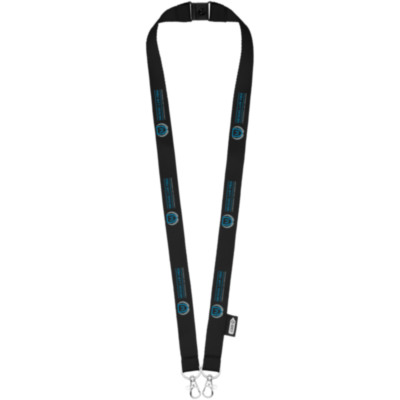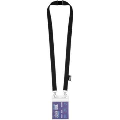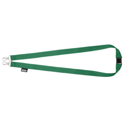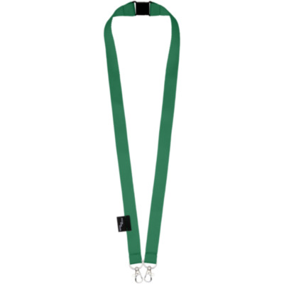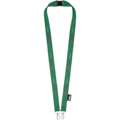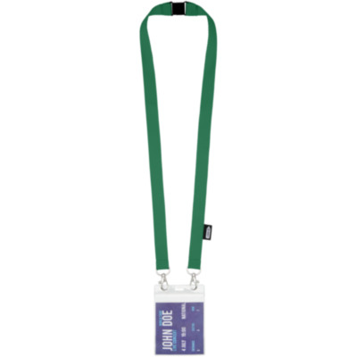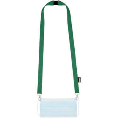 Recycled PET lanyard with breakaway closure to hold a face mask and badge holder. Comes with two high quality oval hooks with lobster clips. Particularly suitable for wide card holders. Offers great value for money and impressive logo sizes when looking for a green choice.
