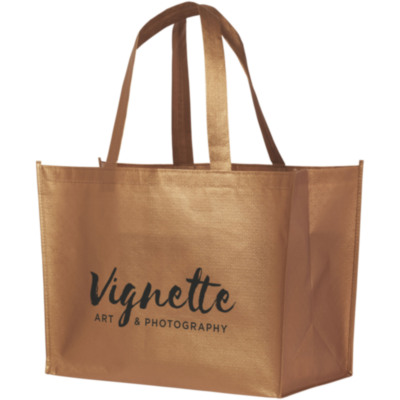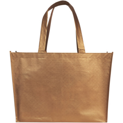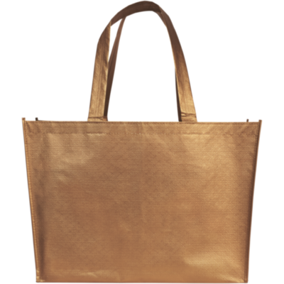 A lightweight, flexible shopping tote bag with a laminated and shiny metallic appearance. Made from 80g of laminated, non-woven PolyPropylene.