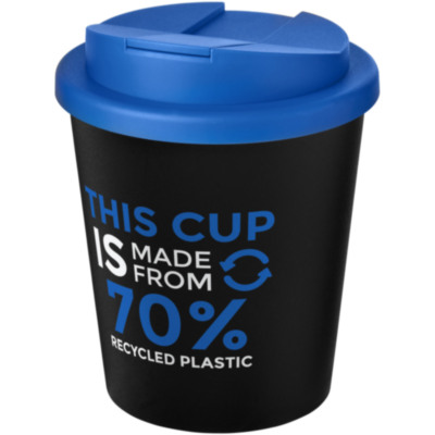 Double-wall insulated tumbler with a secure twist-on spill-proof lid. The lid clips closed to better prevent spillages, and is manufactured without silicone for a fully recyclable mug. The tumbler is 70% recycled in total, with a recycled mug with black inner layer, and a standard lid. The shades of black may vary due to the nature of the recycled material. EN12875-1 compliant, dishwasher safe, and microwave safe. Volume capacity is 250 ml. Packed in a recycled PE plastic bag. Made in the UK.