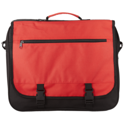 Exhibition bag with adjustable shoulder strap, buckle closure flap, zipper pocket in flap, zippered main compartment and several open pockets under flap.