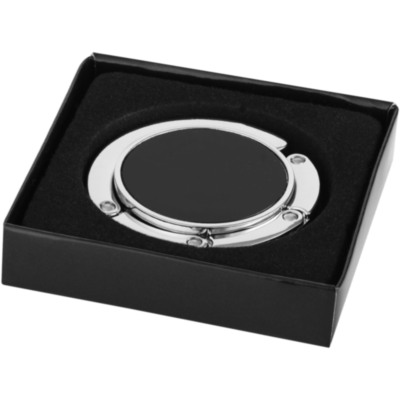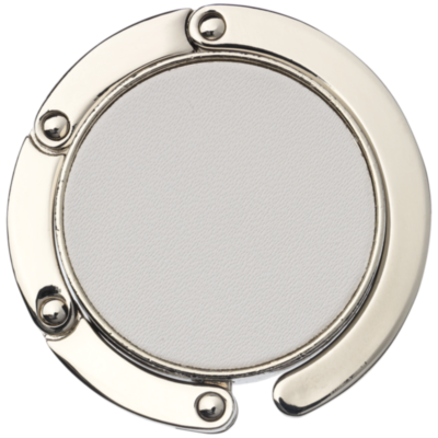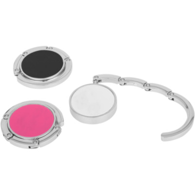 Foldable bag hanger which keeps a bag clean and safe. Hanger can be attached at the edge of a surface and can hold up to 4.5kg.