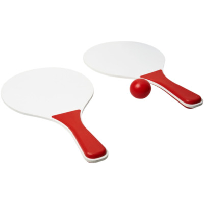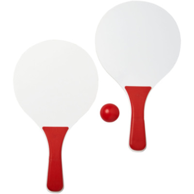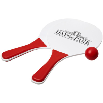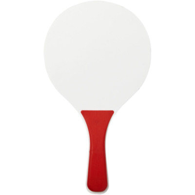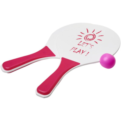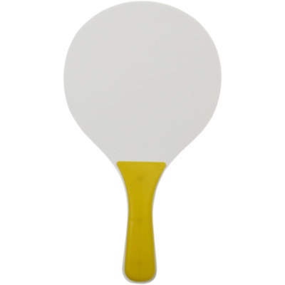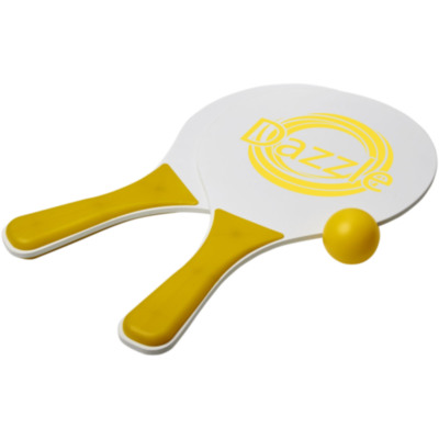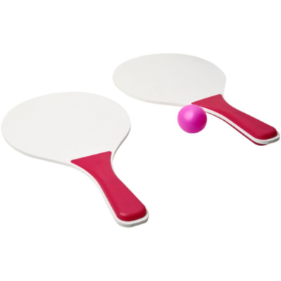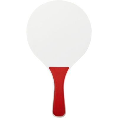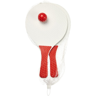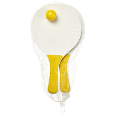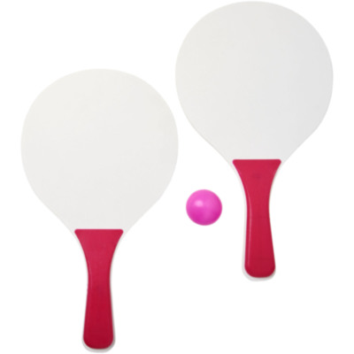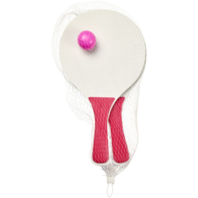 Always fun with this beach game set offered in a wide range of colours. This durable beach game set is made of MDF wood with coloured PP handle. Packed together with an like colour soft ball in an net packing, allowing easy to carry on a fun day to the beach.