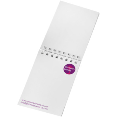 Desk-Mate® spiral A7 notebook. This notebook includes a white or black wire, a glossy card cover (250 g/m2), and 50 sheets (80 g/m2) blank paper. You can customise the pages of this versatile notebook with any design - so whether you want lined paper, squares or dots - anything is possible!