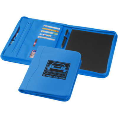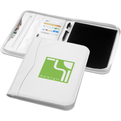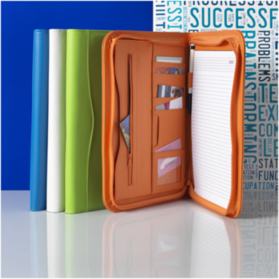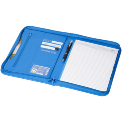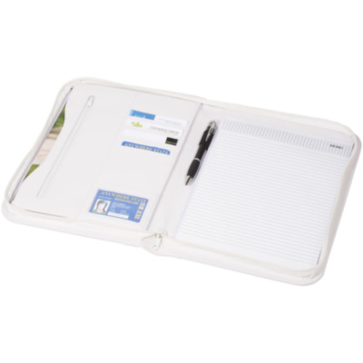 The perfect item with which every employee indirectly contributes to greater awareness of every brand: the Ebony portfolio. The A4-sized portfolio includes a handy compartment plus a zipper pocket for storing documents. Next to this, it has a 20-pages lined notepad plus a pen loop (pen and accessories not included). Close the portfolio with the zipper to keep the contents neat and well protected. The portfolio is made of durable imitation leather and offers plenty of space for large logos.