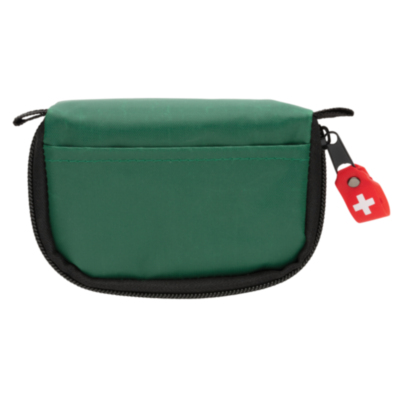 Pouch with one front pocket, one black zipped main compartment and belt loop on reverse side of pouch. Content: triangle bandage, PBT bandage, alcohol pad, plasters, scissors, pin and tape, conform EN 13485:2003.