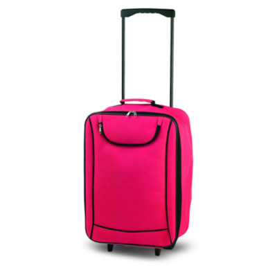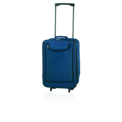 2 wheeled folding trolley in resistant 600D polyester with vivid bicolor design. Main compartment with lined inside, double puller zipper closure and front zippered pocket. With padded carry handle and reinforced base with resistant stands and matching color wheels.
