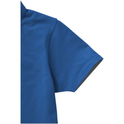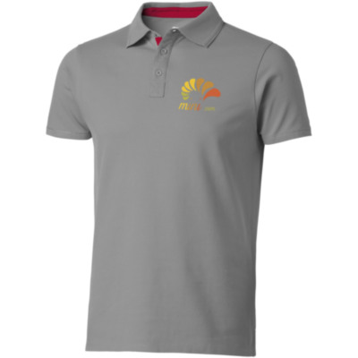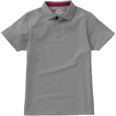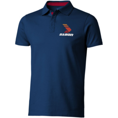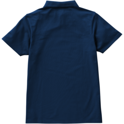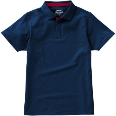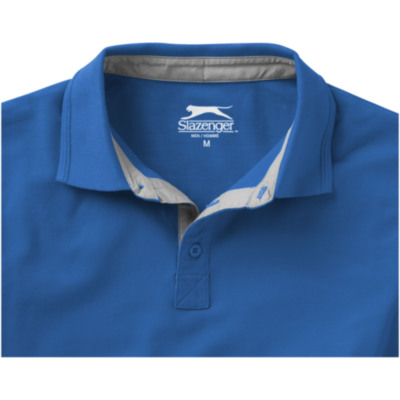 Flat knit collar. Embossed tipping. Poplin inside collar stand and cuffs. Three button placket. Side slits. Dyed-to-match engraved buttons. Heat transfer main label for tagless comfort.