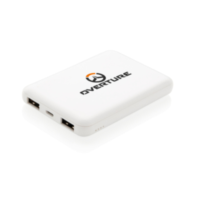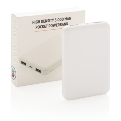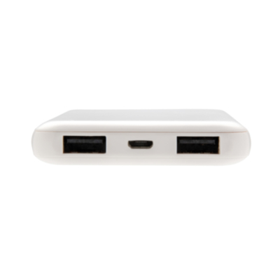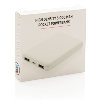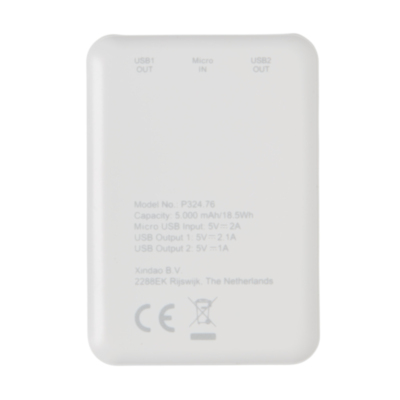 Ultra-compact 5.000 mAh powerbank made out of lightweight ABS that fits into your pocket so perfectly that you can take it anywhere you go. When fully charged it will provide you with enough energy to re-charge your mobile phone up to three times. The powerbank contains a long lasting grade A 5.000 mAh high-density lithium polymer battery. With dual USB port. The power indicators will indicate the remaining energy level so you always know when to re-charge. Input 5V/2A. Output USB 1: 5V/2A Output USB 2: 5V/1A
