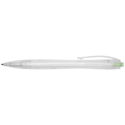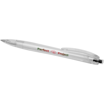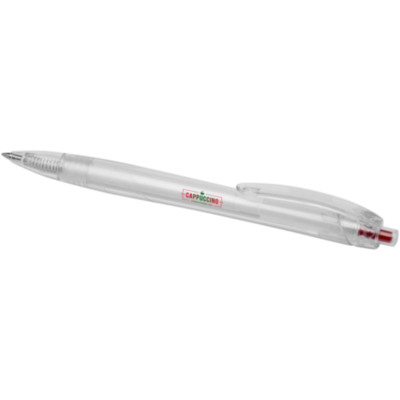 Click action ballpoint pen made from recycled PET, reducing the use of virgin plastic. The ballpoint pen comes with a transparent barrel and coloured push button. It is preloaded with a blue refill and can be combined with the 107763 Honua RPET notebook.