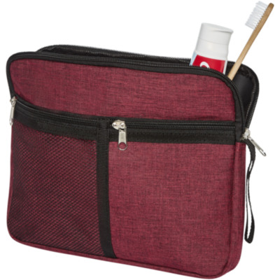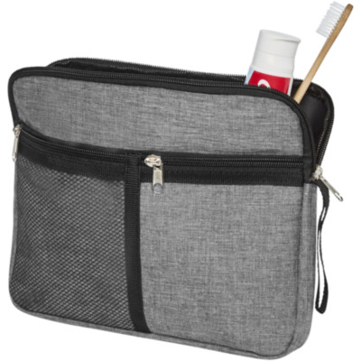 Toiletry bag with zipperered closure main compartment designed with heathered colour effect. Features two front small pockets (1 meshed and 1 regular). There may be minor variations in the colour of the actual product due to the nature of the fabric dyes, weaves, and printing.