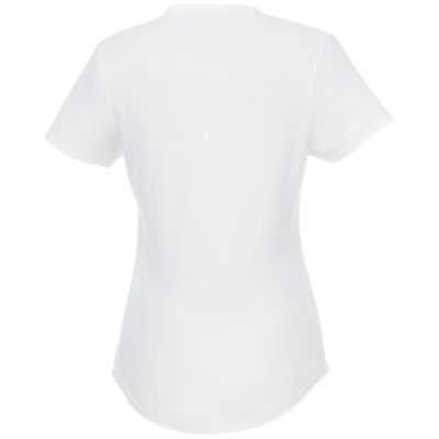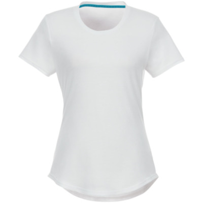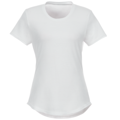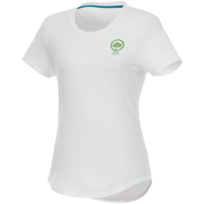 Sustainable promotional apparel. Scoop neck. Side seams. Dropped back hem. Shoulder to shoulder tape. Double needle stitching detail.