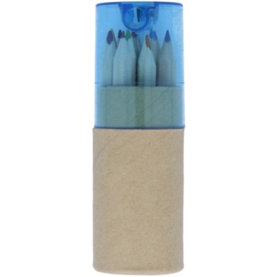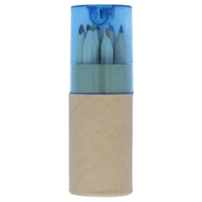 12 piece colouring pencils in recycled paper. Pencil sharpener transparent lid.