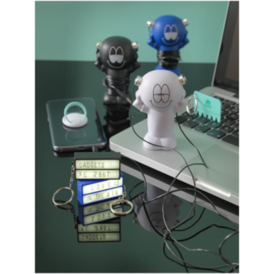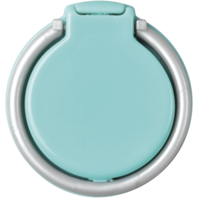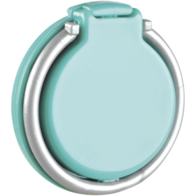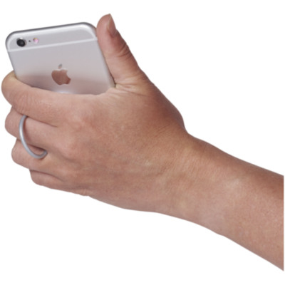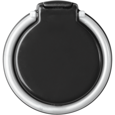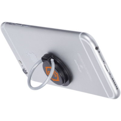Loop ring and phone holder. The ring can be lifted up to be used as a stand or to secure your smartphone while holding it. Adhesive backing attaches firmly to the back of a smartphone. The base of the ring can be rotated for optimal positioning. ABS plastic.