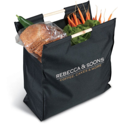 Shopping bag in 600D polyester with wooden handles.