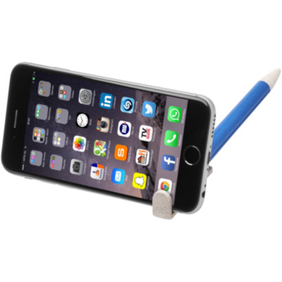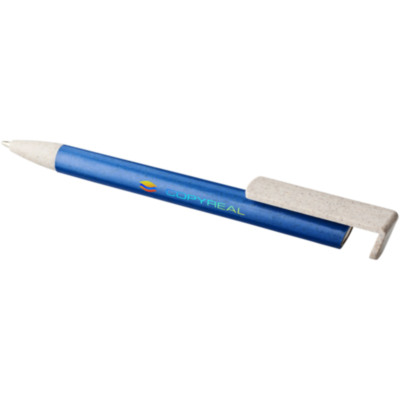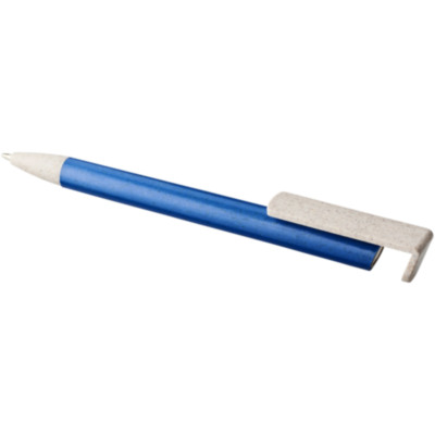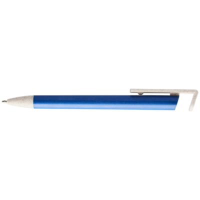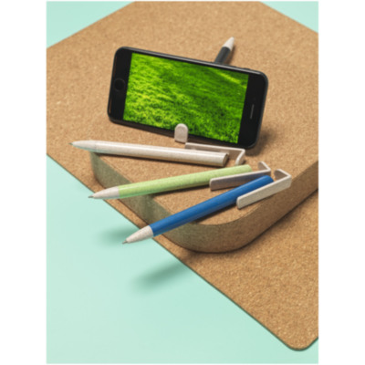 Click action mechanism ballpoint pen made of wheat straw. Wheat straw is left over stalk after wheat grains are harvested, reducing the amount of plastic used. The upper part of the pen doubles as a holder for smartphones for easy handsfree viewing.