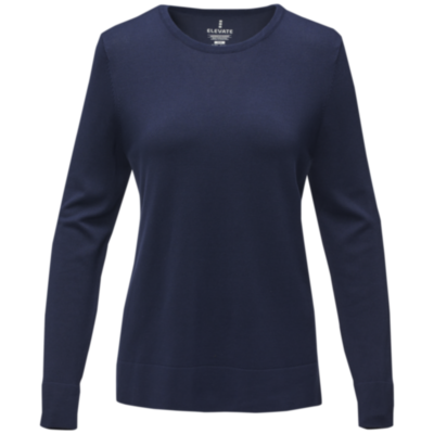 The Merrit women's crewneck pullover – a fusion of timeless style and comfort. Its classic crew neck is complemented by flat knit rib details on the collar, cuffs, and bottom hem, providing a sophisticated charm suitable for any occasion. Made from viscose and nylon blend in a 12-gauge flat knit, it offers a blend of softness, durability, and a lightweight feel. Elevate your wardrobe with the versatile Merrit pullover that embodies elegance and quality. This pullover is designed with a fitted shape for a feminine look.