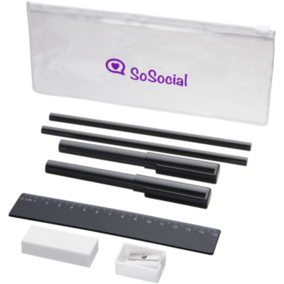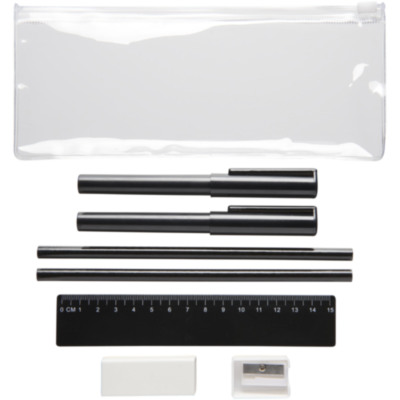 PVC pencil case with 2 ballpoint pens (1 with black ink, the other with blue), 2 pencils, a ruler, a sharpener and an eraser.