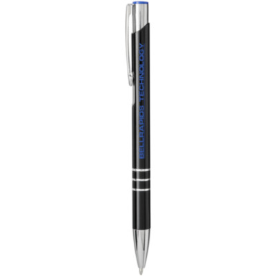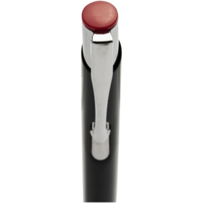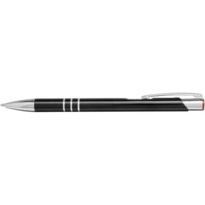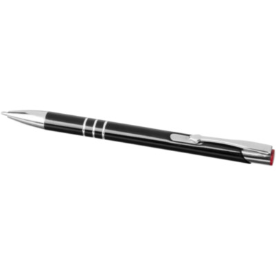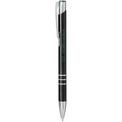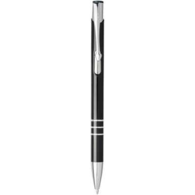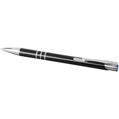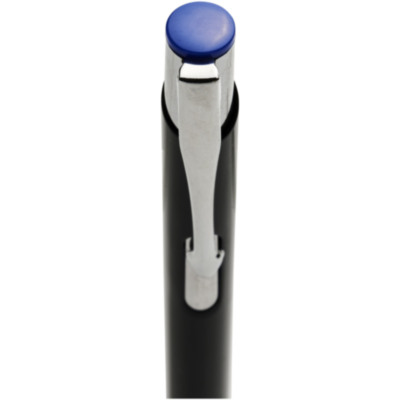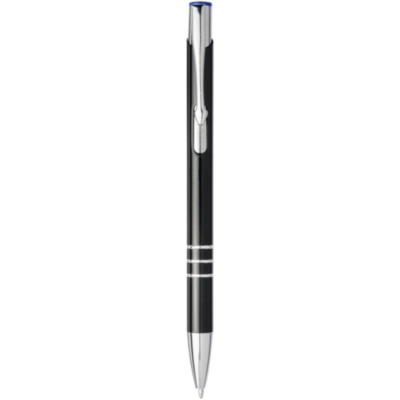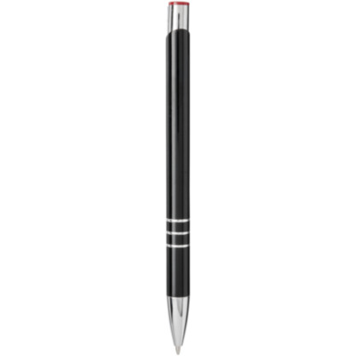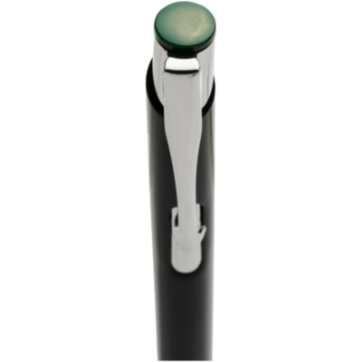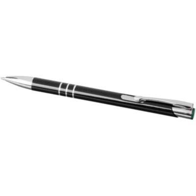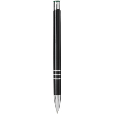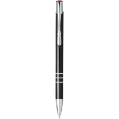 Black barrel ballpoint pen with click action mechanism in a range of various colours at the top of the pen. When laser engraved the colour underneath is revealed, matching the colour at the top of the pen. Pen has a metal clip, aluminium barrel, an ABS tip and top. The extensive and popular Moneta range is available in many different styles and finishes.