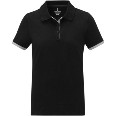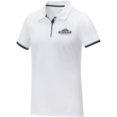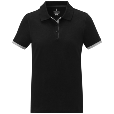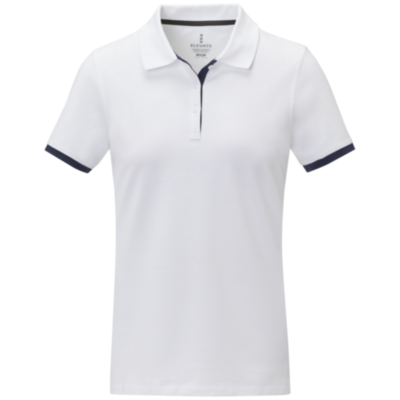 The Morgan short sleeve women's duotone polo is a stylish and comfortable option for any casual or business setting. Made from a 200 g/m² piqué knit cotton fabric, this polo is both durable and breathable. Featuring a flat knit collar and rib cuffs with contrast colour detailing, this polo offers a modern twist on a classic design. The two-button placket and pick-stitch details add an extra touch of sophistication, and the satin neck tape and heat transfer main label provide comfort and ease of wear. This polo is designed with a fitted shape for a feminine look.