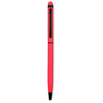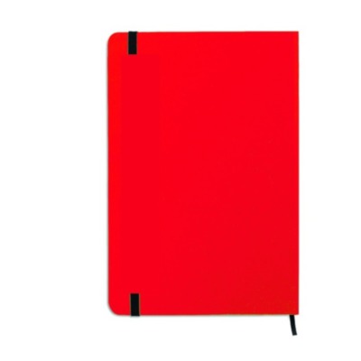 A5 notebook with 2-in-1 stylus ball pen. Hard PU cover. Casebound. 144 lined pages (72 sheets). Matching ball pen with touch screen stylus. Blue ink. Matching elastic closure strap and ribbon bookmark.
