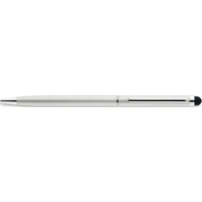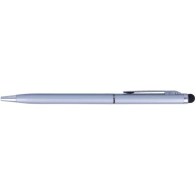 Twist action ball pen in aluminium with stylus and shiny chrome clip. Blue ink.