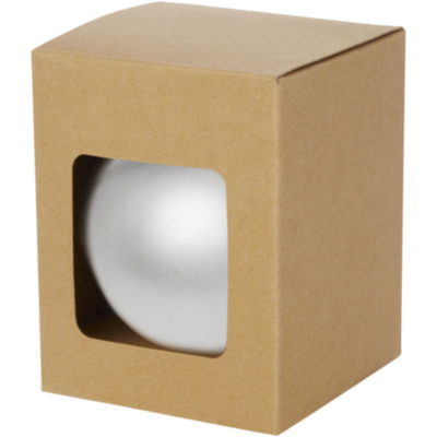 Christmas bauble with shiny finish, a round hanger and a 5.5 cm string. Individual kraft paper gift box with front window to show the decoration area.