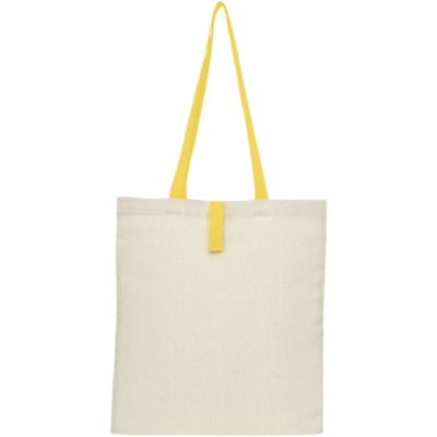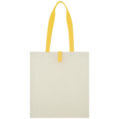 Tote bag with an open main compartment and coloured handles with a dropdown height of 32 cm. Features a strap with button closure to keep the bag folded. Resistance up to 8 kg weight.