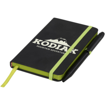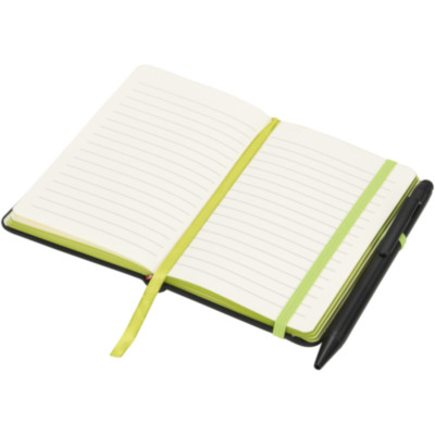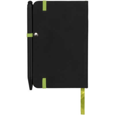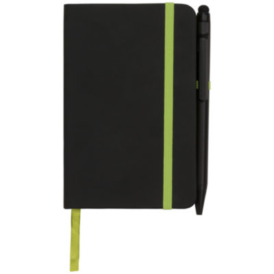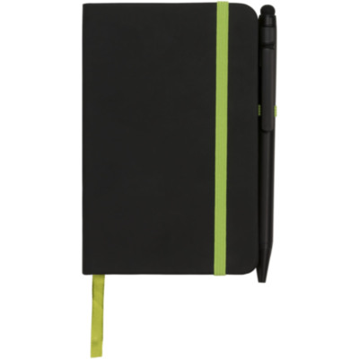 Modern and stylish black notebook, with a soft-feel tactile cover. Supplied with coloured edging and matching coloured page marker, pen loop and closure strap. Supplied with a plain black stylus ballpoint pen. Inlcudes 96 sheets (70g/m2) cream lined paper.