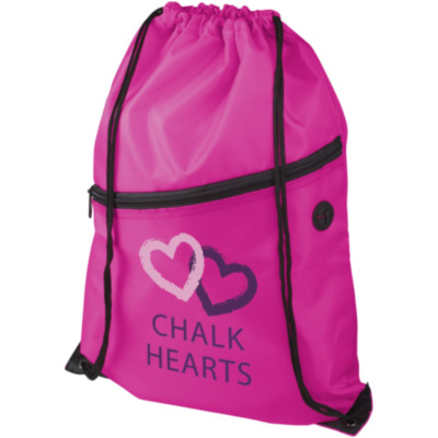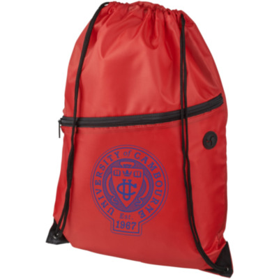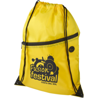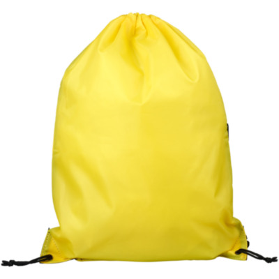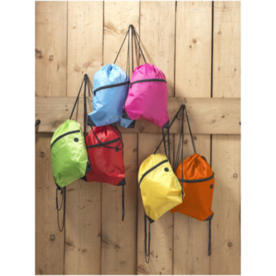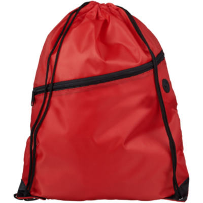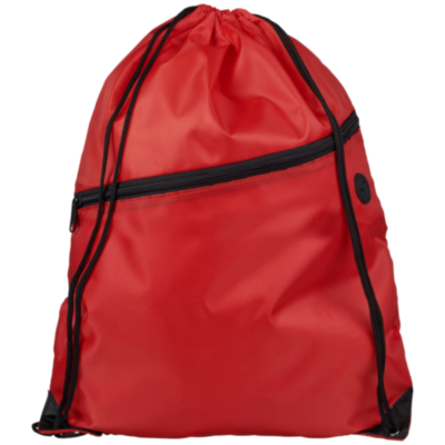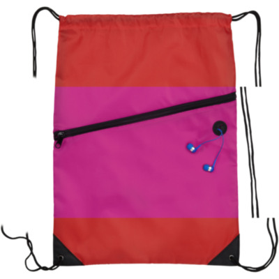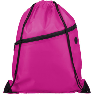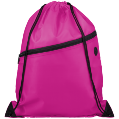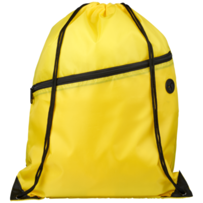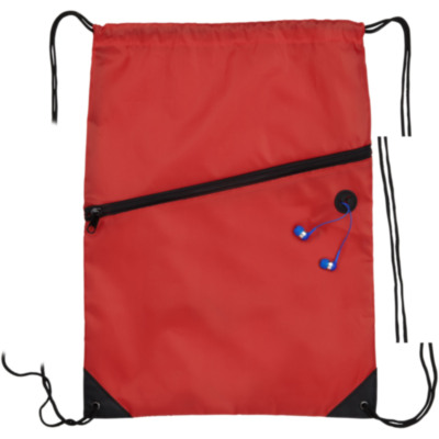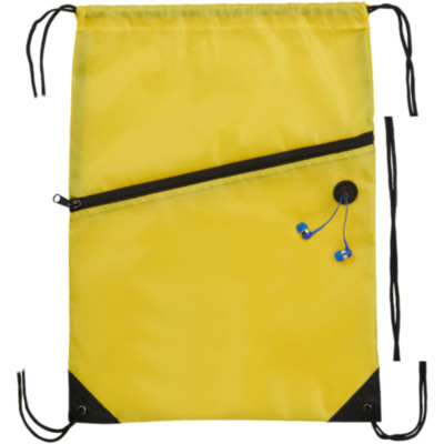 Large main compartment with string closure in black colour. Features a zippered front pocket, an earbud port, and reinforced corner tabs. Resistance up to 5kg weight.