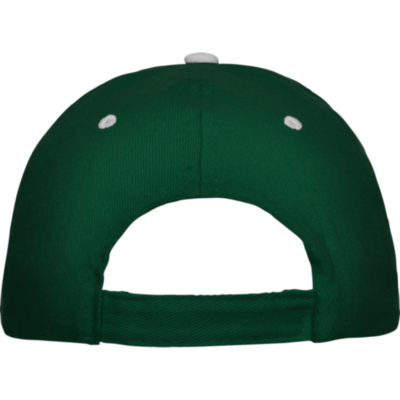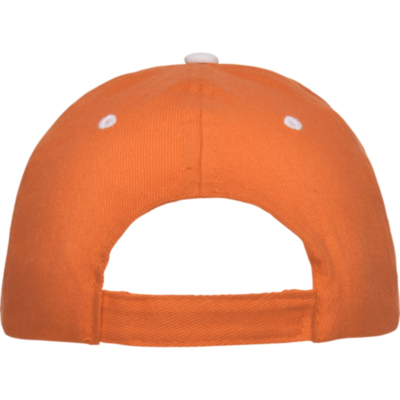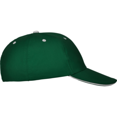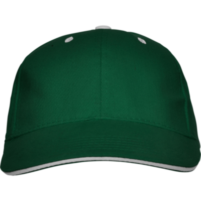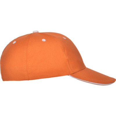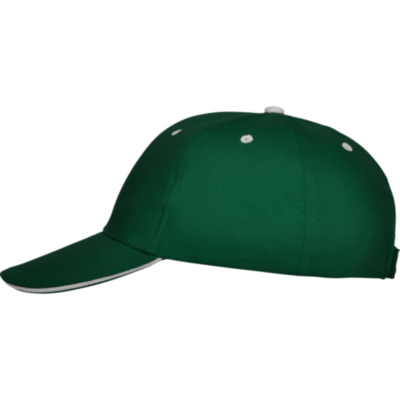 6-panel sandwich cap with 6 contrasting embroidered vent eyelets. 6 backstitch lines on peak. Inner sweatband. Velcro fastening.