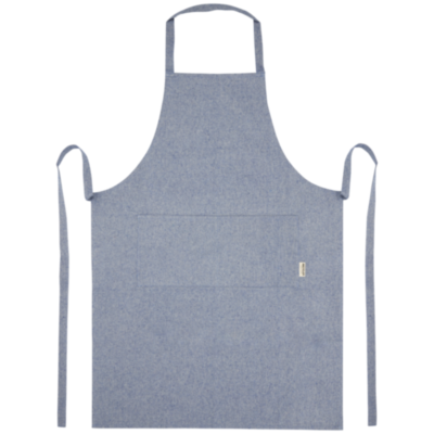 Apron made of 200 g/m² recycled cotton polyester blend. Features 2 adjacent pockets with a combined size of 45 x 20 cm, and a 1 metre tie back closure. Recycled cotton is manufactured from pre-consumer waste generated by textile factories during the cutting process. Due to the nature of recycled cotton, there may be a very slight colour variation. This feature distinctly adds to a more authentic appearance. Length of the neck strap: 55 cm.