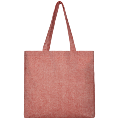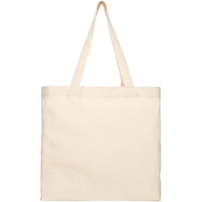 Tote made of 210 g/m² recycled cotton polyester blend. Recycled cotton is manufactured from pre-consumer waste generated by textile factories during the cutting process. Tote with gusset and large main compartment. Features two handles with a dropdown height of 31 cm. Resistance up to 10 kg weight. There may be minor variations in the colour of the actual product due to the nature of the production process