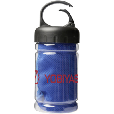 Quick absorbing, quick drying, and washable cooling towel made of strong and durable polyester for keeping cool during work-out or any outdoor activity. Comes in a PET container with a carry handle with a built-in carabiner for easy carrying. Available in 5 fresh colours. Large decoration logo area on the container, decoration also possible on the cooling towel itself. Size: 30 x 80 cm.