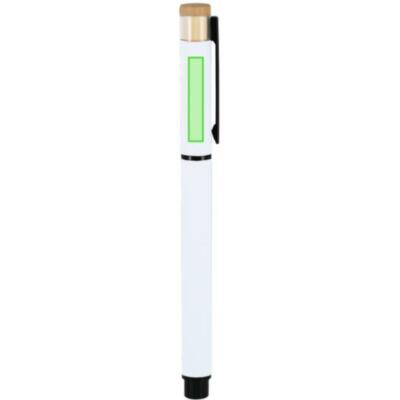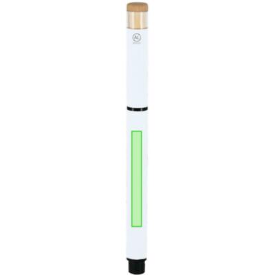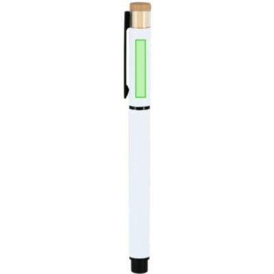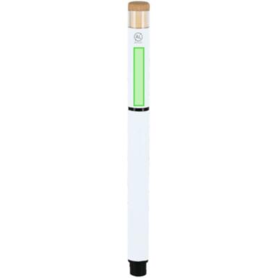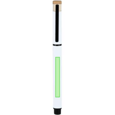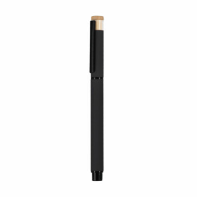 Elegante roller fabricado en bambú y Aluminio Reciclado. Con cuerpo en acabado gomoso. Clip y empuñadura en negro. Con cartucho jumbo, en tinta azul y con cierre de capucha. Con distintivo logo de Aluminio Reciclado.