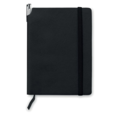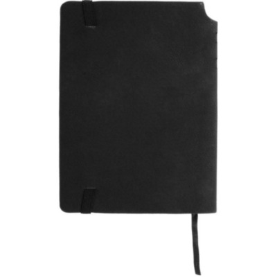 A5 notebook with soft PU cover. Casebound. 160 lined pages (80 sheets). Matching elastic closure strap and ribbon bookmark. Expandable inner pocket in the back. Pen holder in the spine.