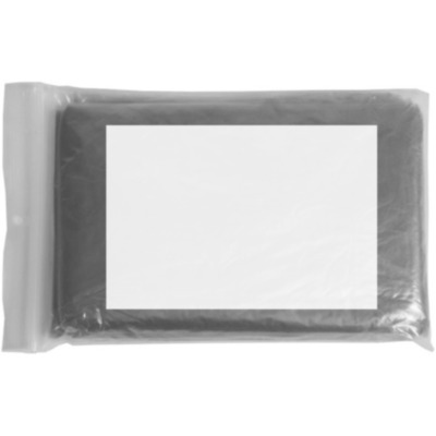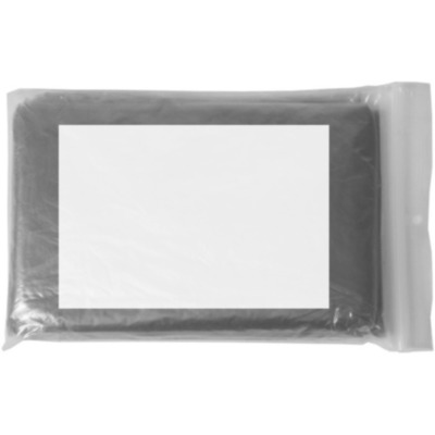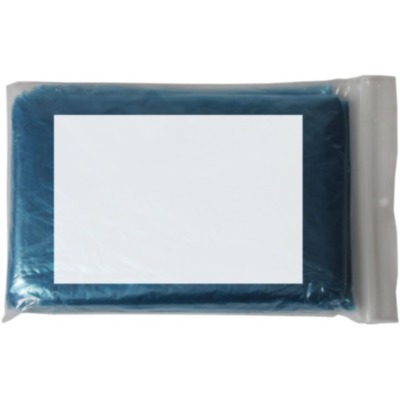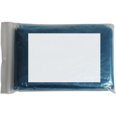Foldable plastic poncho with attached hood, packed in a transparent polybag.