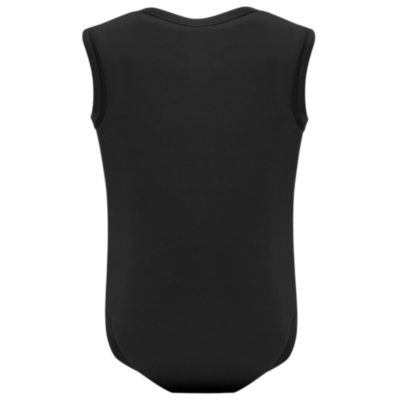 Sleeveless single jersey bodysuit. Crew neck, 1x1 round ribbed armhole and edge. Snap button fastening in the crotch. Crossed shoulder opening.