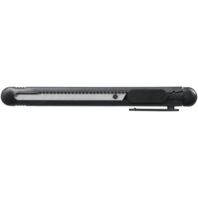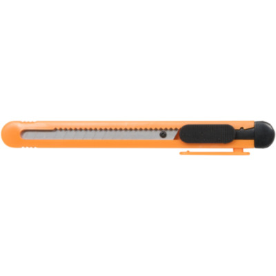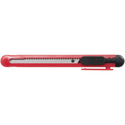Retractable utility knife with replaceable 80x9mm, 12-segment snap-off blade. Integrated blade-snapping tool and pocket clip.