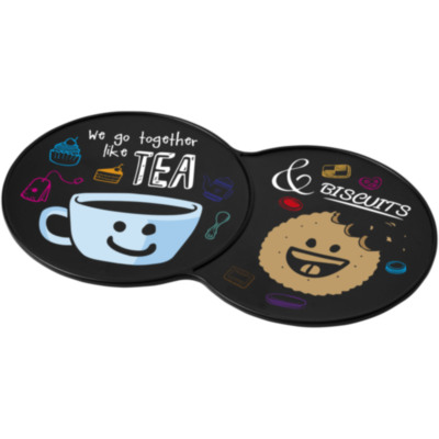 Extended coaster that provides space for multiple drinks or a combination of a drink and a biscuit.