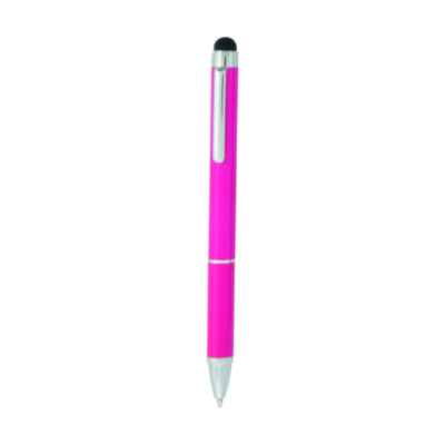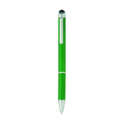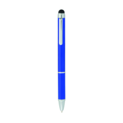 Pointer ball pen with twist mechanism and aluminum body in smooth metallic finish in bright tones. Details and rings in silver color. Blue ink.